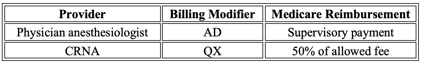 Under Medicare rules, medical supervision (modifier AD) represents a substantially reduced reimbursement category compared with medical direction. Under medical supervision, the physician anesthesiologist is generally limited to three base units per case and cannot bill anesthesia time units. In some circumstances a single additional "time unit" may be allowed if the physician is present for induction, but otherwise the physician side of the claim loses all time-based reimbursement. The CRNA can only bill 50% of the time units and 50% of the base units under QX billing. So "money is left on the table"