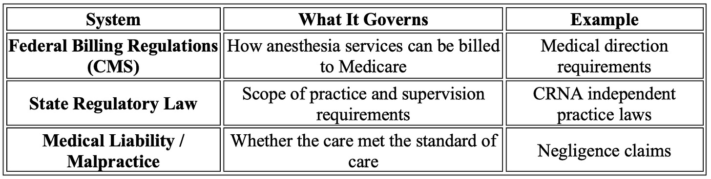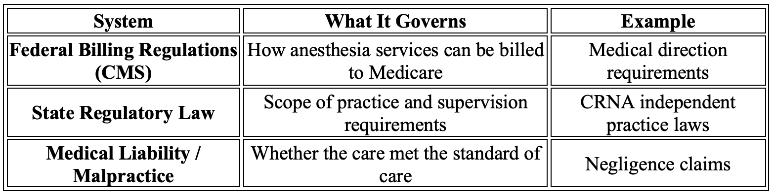 Confusion arises when these systems are treated as interchangeable. A practice model may be fully compliant with state law but violate Medicare billing requirements. Conversely, a case could meet all billing documentation standards yet violate the hospital policies, DOPS, and bylaws (if it says an MDA has to be there for extubation and they aren’t thats a violation regardless of state law or federal law).
