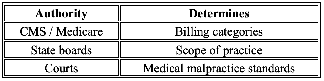 Another common misunderstanding is assuming that Medicare billing rules determine scope of practice.