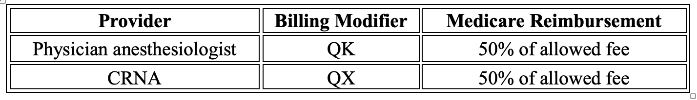 From a reimbursement perspective, this means the medical direction framework primarily redistributes payment across multiple clinicians rather than increasing the total payment for the anesthesia service. In contrast, when anesthesia care is provided by a CRNA practicing independently and billed under modifier QZ, or an MDA independely billed under AA, the full reimbursement for the case is billed under a single provider claim. So the payment is the same but medical direction requires two providers to be paid and utilized instead of opening a second OR.